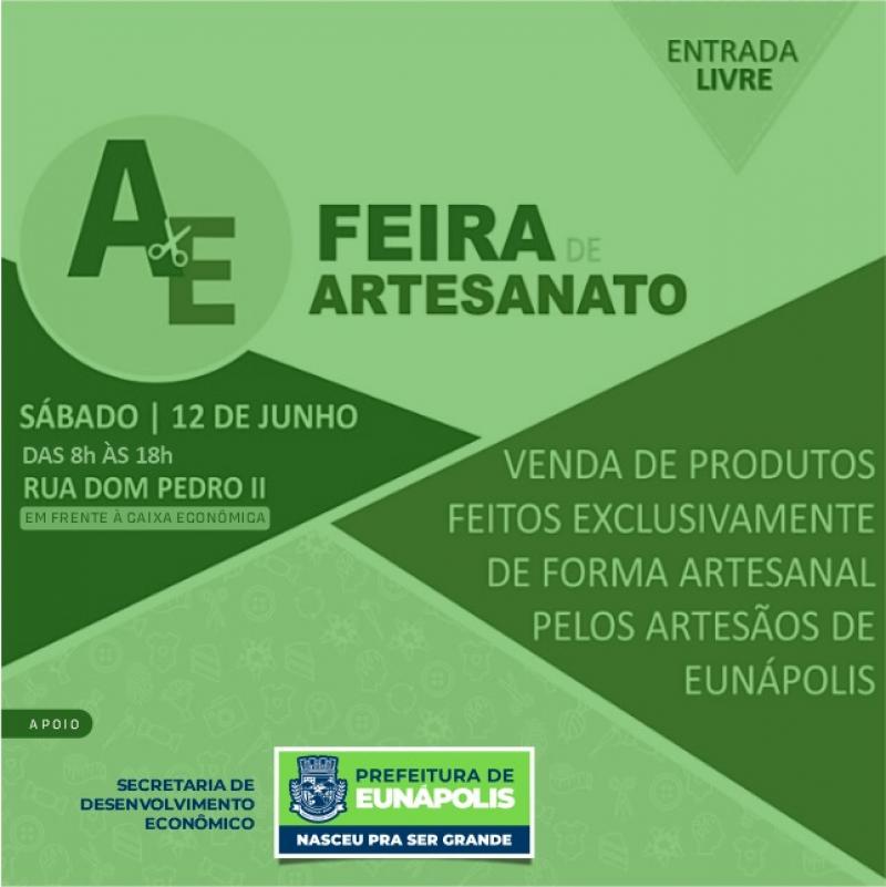 Durante todo o dia 12, sábado, na Rua Dom Pedro II, em frente à agência da Caixa Econômica Federal, estará acontecendo grande Feira de Artesanato de Eunápolis. O evento terá início às oito e vai até às 18 horas. Todo o local da feira será preparado, com banheiros químicos e estará obedecendo todos os protocolos exigidos pelas autoridades sanitárias, com higienização do ambiente e fornecimento de álcool 70%.
