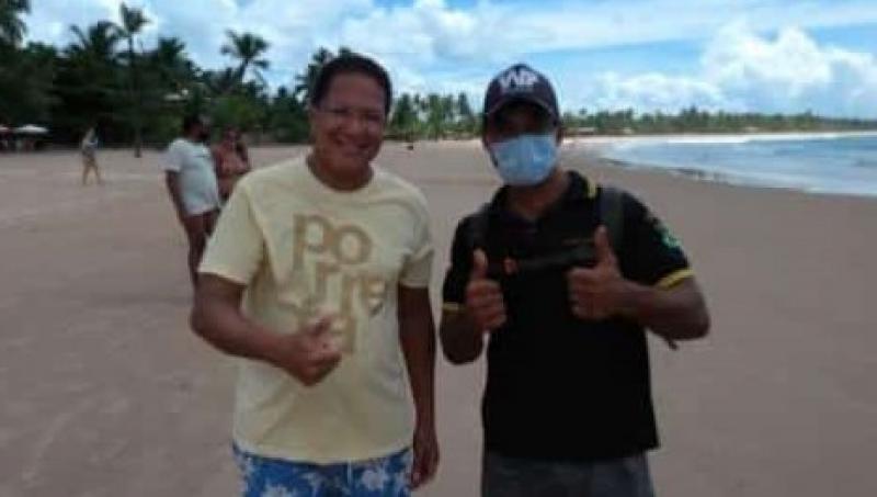 Circula as redes sociais uma foto da Augusto de Castro, na praia, sem máscaras. O prefeito de Itabuna está ao lado de homem usando o equipamento de proteção contra o novo coronavírus, tendo ao fundo um casal de desmascarados.