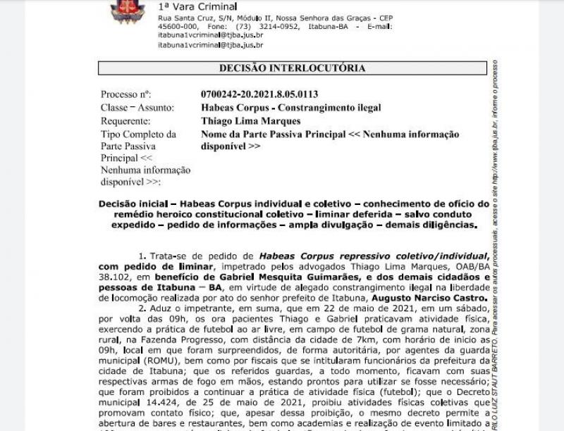 Num despacho de sete laudas, o magistrado decidiu pela “prática de atividade física em campos, quadras e adjacentes, com vistas à manutenção da saúde ou seu alcance”. A pandemia em Itabuna virou um “baba”.