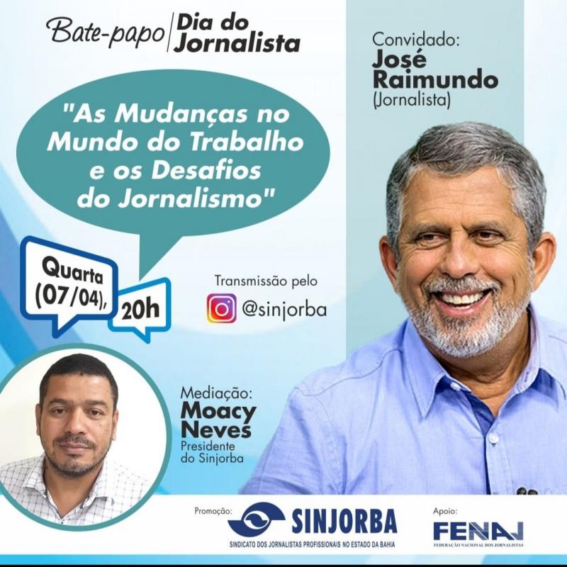 “As mudanças no mundo do trabalho e os desafios do Jornalismo” é o tema de um bate-papo no ambiente virtual que o Sinjorba-Sindicato dos Jornalistas Profissionais da Bahia promoverá nesta quarta-feira, 07 de abril, dia dedicado ao Jornalista. Terá como convidado, José Raimundo (@joseraimundo541), ex-repórter da TV Bahia e especial da Rede Globo, com uma carreira respeitada, marcada pela ética e compromisso profissional.