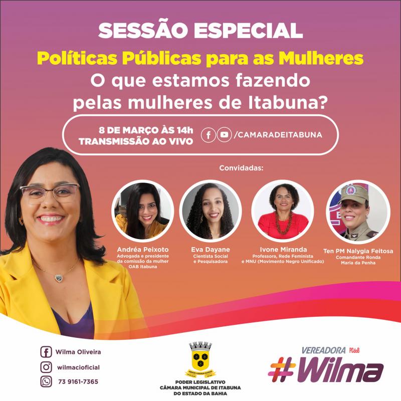 “Políticas públicas paras as mulheres: O que estamos fazendo pelas mulheres de Itabuna?” é o tema da Sessão Especial” é o tema da Sessão Especial que a Câmara de Itabuna realizará na tarde da próxima segunda-feira, dia 08.