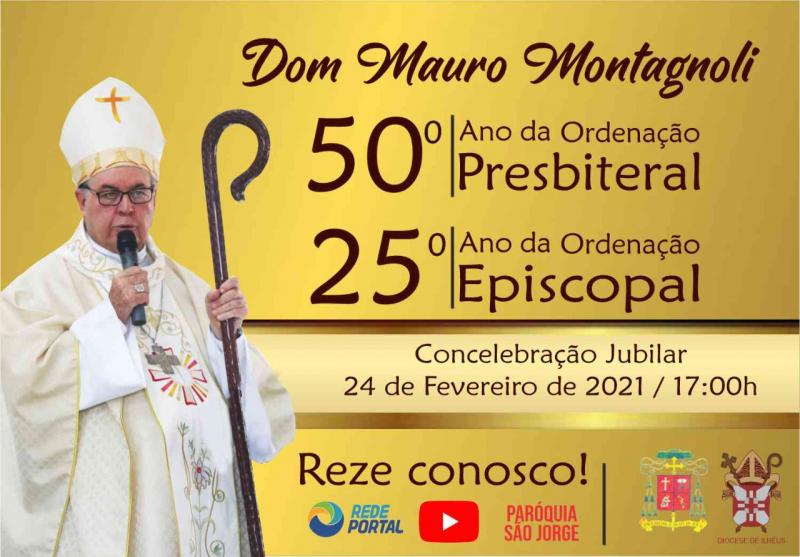 A comunidade católica do sul da Bahia participa nesta quarta-feira, dia 24 de fevereiro, da concelebração Jubilar dos 50 anos de sua ordenação presbiteral e dos 25 anos de episcopal de Dom Mauro Montagnoli, bispo diocesano da Diocese de Ilhéus. A celebração está prevista para ocorrer às 17 horas, na Paróquia São Jorge, será acompanhada pelas redes sociais da diocese.