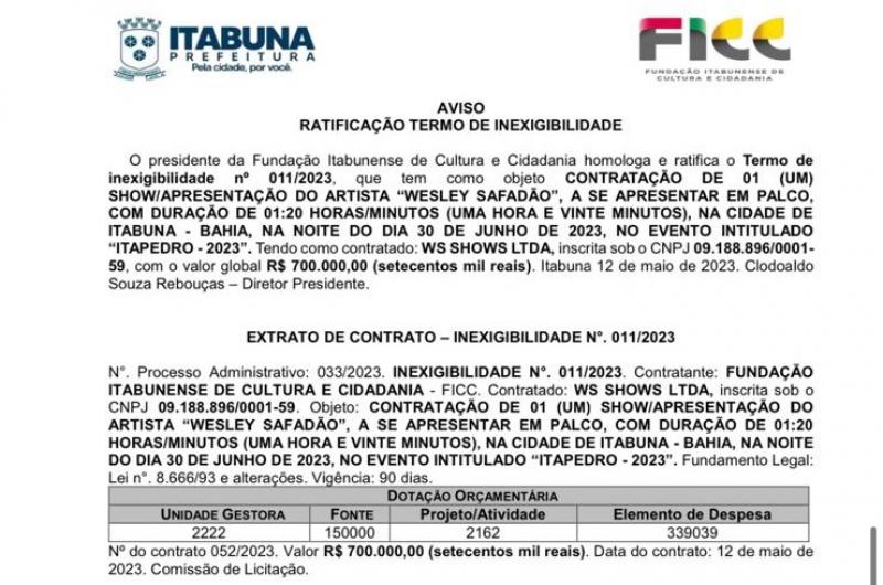 Uma representação ao Ministério Público pede o ingresso, na Justiça, de uma ação pública que sejam suspensas as contratações feitas pela FICC dos artistas que deverão se apresentar no Itapedro deste ano. A alegação é que os contratos, celebrados por meio de inexigibilidade de licitação, são onerosos aos cofres da Prefeitura de Itabuna.
