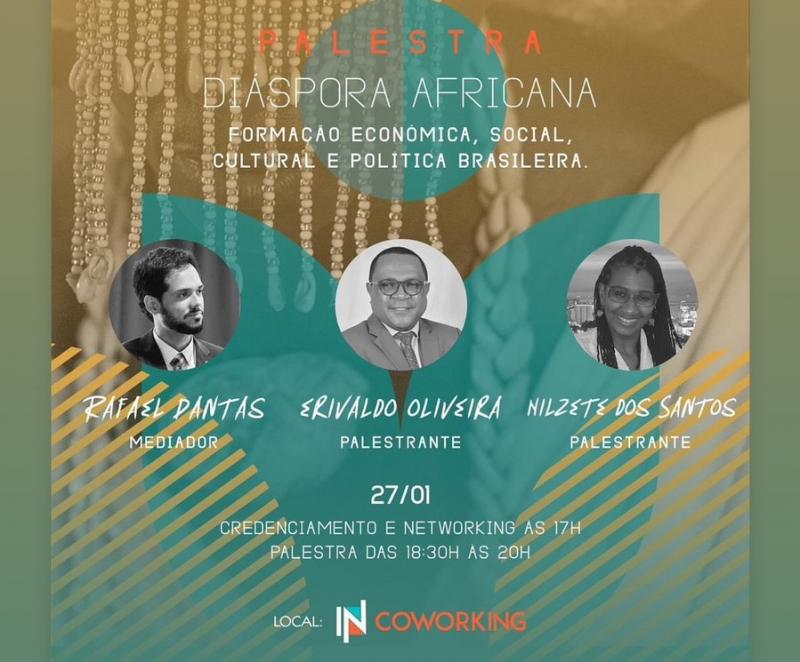 Diáspora Africana–Formação econômica, social, cultural e política brasileira é o tema da palestra que o Movimento InNova Coworking promove na noite desta sexta-feira, dia 27, em Salvador. O evento que reunirá três palestrantes baianos, está previsto para ocorrer das 18h30min às 20 horas, no CEO Salvador Shopping, Torre Nova Iorque, no Caminho das Árvores.