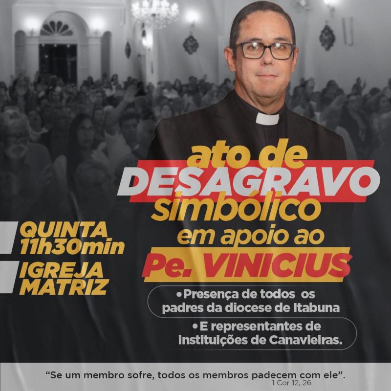 Está previsto para o final da manhã da próxima quinta-feira, dia 24, a realização de um desagravo simbólico em apoio ao padre Vinicius Mascarenhas de Canavieiras. O ato, que deverá contar com a participação dos quarenta e três padres da Diocese de Itabuna, de representantes dos movimentos da Igreja Católica e dos mais diversos segmentos da sociedade, ocorrerá na Igreja matriz local.