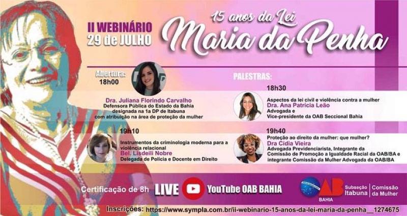 A Comissão da Mulher da subseção de Itabuna da OAB-Ordem dos Advogados do Brasil realizará esta semana o II Webnário sobre os quinze anos da lei Maria da Penha. O evento terá início às 18 horas desta quarta-feira, dia 28, com a palestra de abertura, e segue com a programação até as 21h30min.