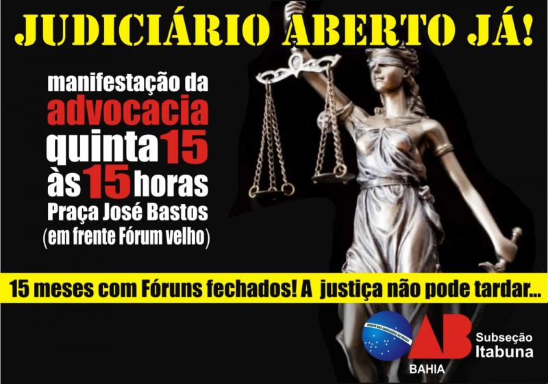 Advogados que atuam em municípios do sul da Bahia anunciam uma manifestação pública em defesa da reabertura dos fóruns da região. O ato que está previso para ocorrer às 15 horas na praça José Bastos, em frente ao prédio onde funcionou o Fórum Ruy Barbosa, está sendo organizado pela subseção de Itabuna da Ordem dos Advogados do Brasil.